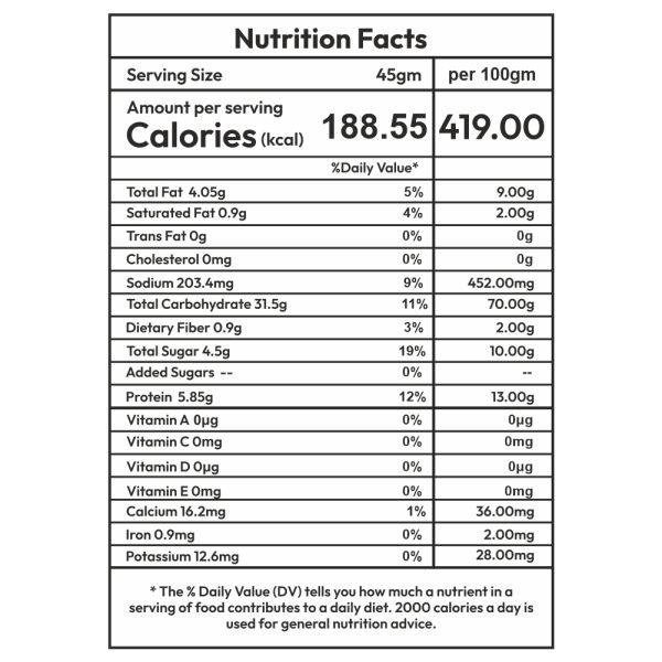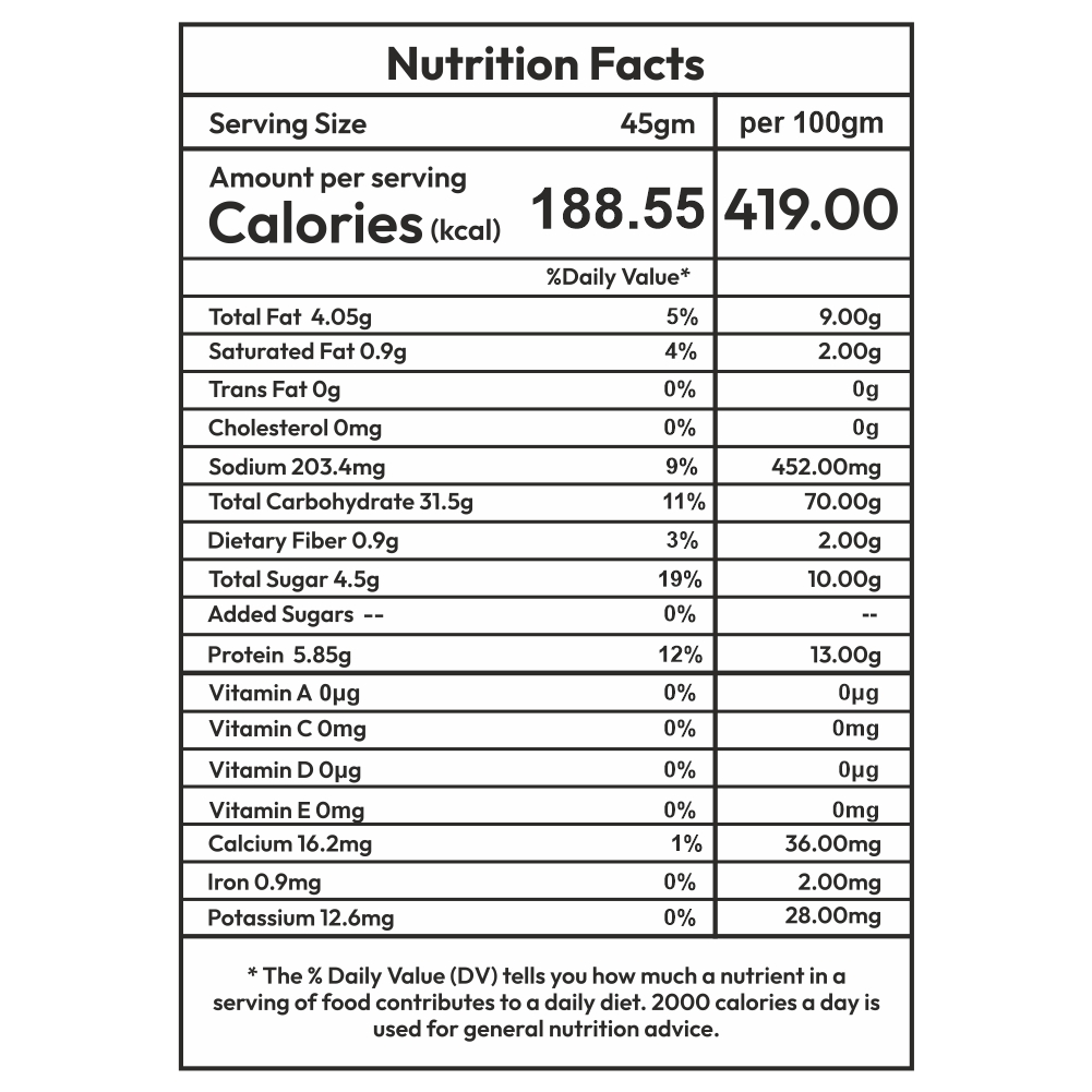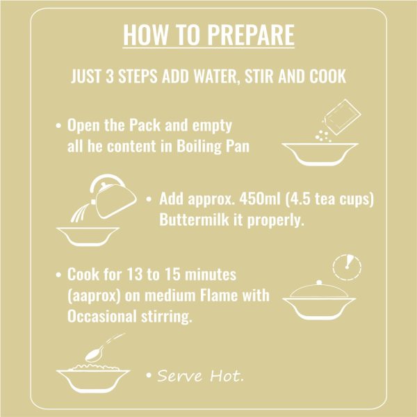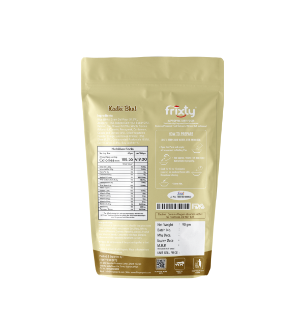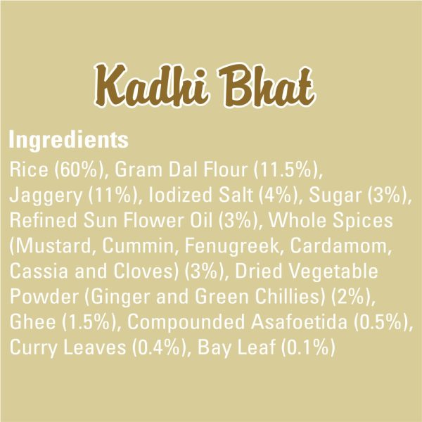INGREDIENTS | Rice (60%), Gram Dal Flour (11.5%), Jaggery (11%), lodized Salt (4%), Sugar (3%), Refined Sun Flower Oil (3%), Whole Spices (Mustard, Cummin, Fenugreek, Cardamom, Cassia and Cloves) (3%), Dried Vegetable Powder (Ginger and Green Chillies) (2%), Ghee (1.5%), Compounded Asafoetida (0.5%), Curry Leaves (0.4%), Bay Leaf (0.1%) |