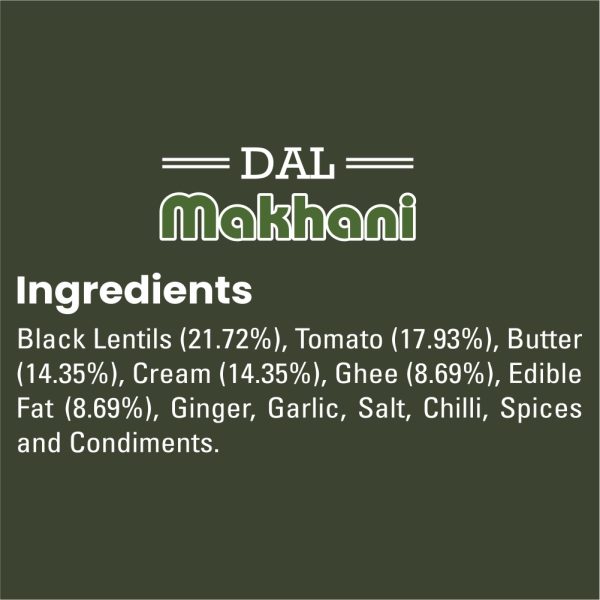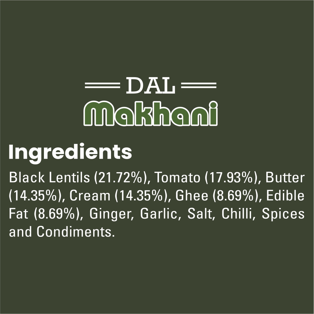 INGREDIENTS | Black Lentils (21.72%), Tomato (17.93%), Butter (14.35%), Cream (14.35%), Ghee (8.69%), Edible Fat (8.69%), Ginger, Garlic, Salt, Chilli, Spices and Condiments. |